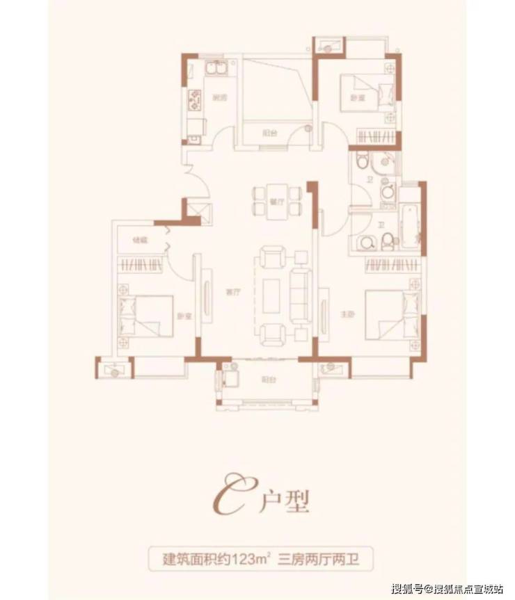 123㎡的3大三房是目前投资市场比较火的户型,标准的飞机户型,南北通透+三开间朝南,主卧套房设计,自带卫生间,适配对品质有要求或者首改客户。